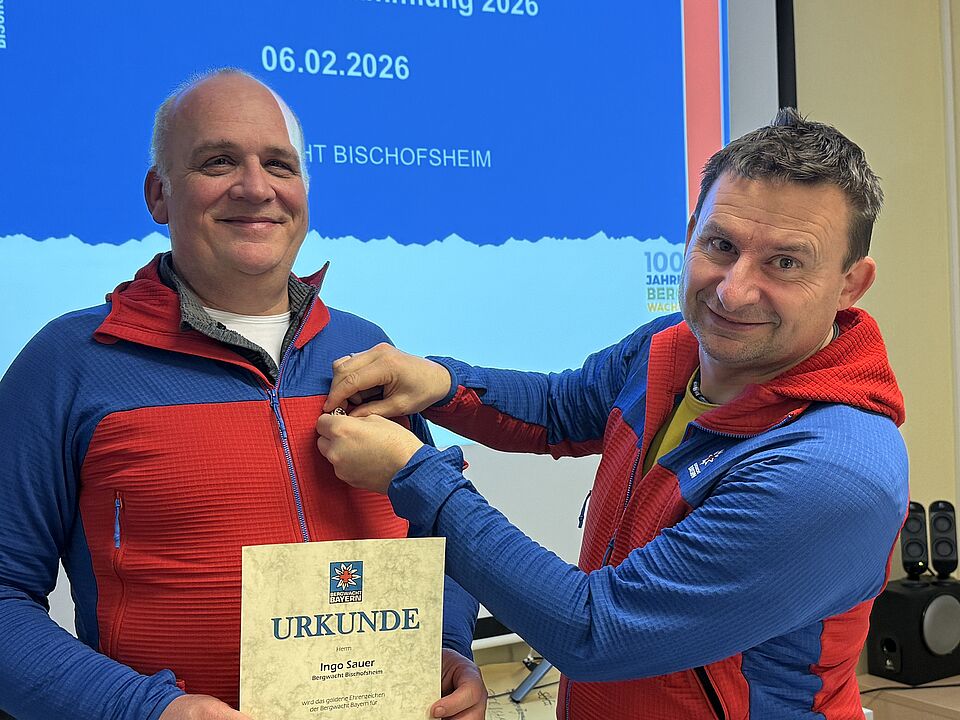 Erfreulich: Zum Abschluss konnte Oliver Scheuplein mit Bruno Büchs und Ingo Sauer zwei Bergwachtler ehren. Beide sind seit vier Jahrzehnten aktiv im Dienst der Bergwacht. Dafür gab es Urkunde und Anstecknadel. Dank sagte abschließend BRK Kreisgeschäftsführer Ralf Baumeister und erwähnte die Unverzichtbarkeit der Bergwachtler und ihren ehrenamtlichen Dienst.