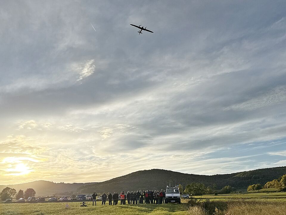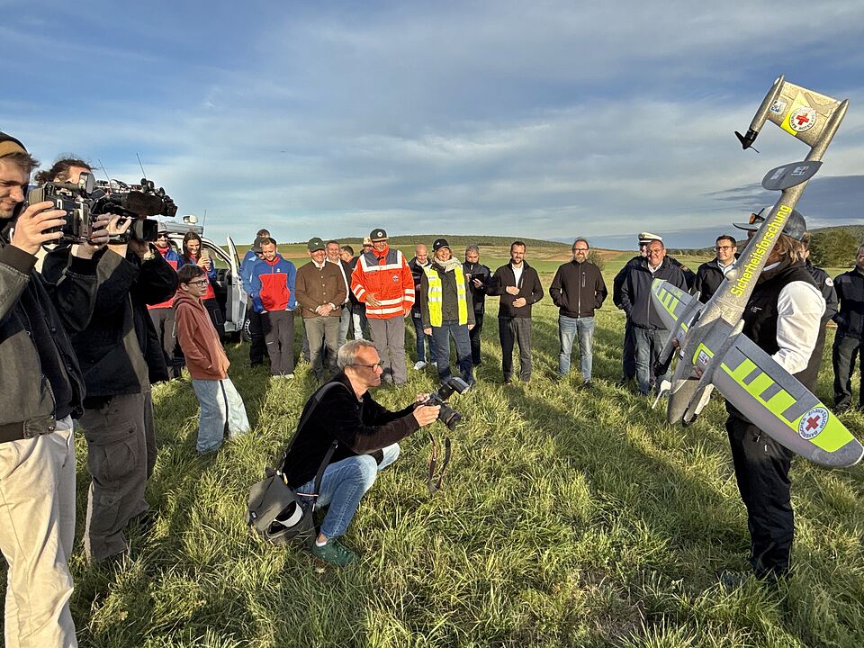 Oberelsbach (hf). Das Team der Bergwacht Rhön-Spessart verfügt über ein High Tech – Drohnensystem, dass am Dienstagnachmittag in Oberelsbach offiziell von Uwe Kippnich, von der Stabsstelle Sicherheit und Forschung beim Bayerischen Roten Kreuz (BRK) vorgestellt wurde. Ein kleines ferngesteuertes Flugzeug, ausgestattet mit Kameras, die Fotos in hoher Auflösung zur Weiterverarbeitung erstellt. Gefördert wurde das Drohen System vom Bundesministerium für Forschung, Technologie und Raumfahrt (BMFTR). Das ist das Ministerium, dem Bundesministerin Dorothee Bär vorsteht. Verständlich, dass sowohl Uwe Kippnich als auch Landrat Thomas Habermann deshalb zeitnah Kontakt mit der Ministerin aufnehmen, um ihr vor Ort in der Rhön das neue, deutschlandeinmalige, Drohnensystem vorzustellen.