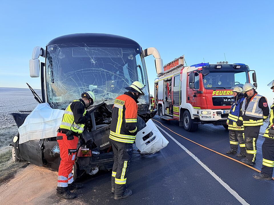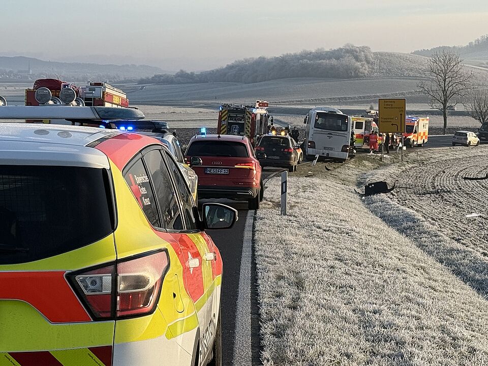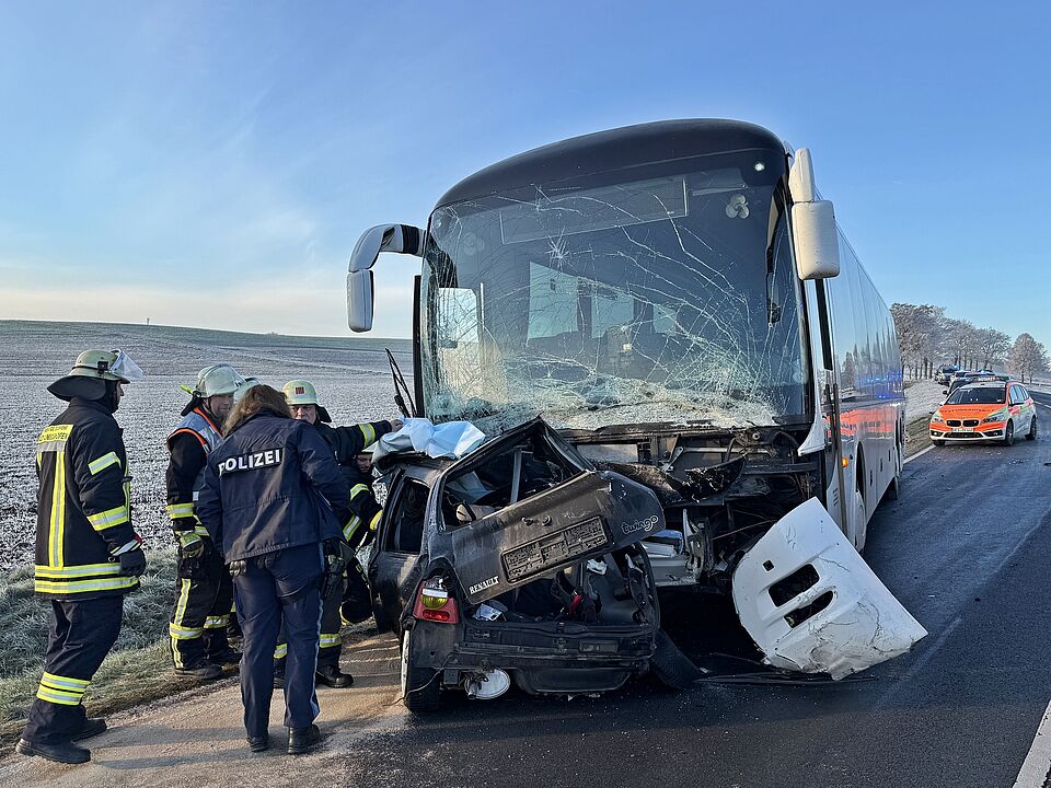 Dort prallte er mit einem entgegenkommenden Schulbus zusammen. Dieser war nur mit dem Fahrer besetzt. Der Bus schleifte das Fahrzeug mit und geriet dann auf den rechten Seitenstreifen, bevor er zum Stehen kam. Das Auto geriet bei dem Aufprall mit der Beifahrerseite unter den Bus. Dabei wurde der 25-jährige Fahrer in seinem Fahrzeug eingeklemmt. Er starb noch an der Unfallstelle an seinen schweren Verletzungen. Bei dem Unfall erlitt der Busfahrer leichte Verletzungen und einen Schock. Eine Zeugin des Unfalls musste ebenfalls vom Rettungsdienst behandelt werden.