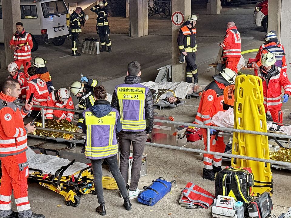 Ganz wichtig war bei der Übung die enge Zusammenarbeit mit dem Rhön-Klinikum Campus. Der Transport von nahezu 20 Patienten erfolgte nach notfallmedizinischer Versorgung, in einer Notablage im Parkhaus, in die Zentrale Notaufnahme (ZNA). Hier war „Massenanfallalarm“ ausgelöst und es wurde die Übergabe der Patienten an das Sichtungsteam trainiert. Lob gab es für das Rhön-Klinikum für die Möglichkeit eine solche Übung in einem leerstehendem, klinikeigenen Objekt während des laufenden Klinikbetriebs durchzuführen. Die Sanitätseinsatzleitung hatten der Organisatorische Leiter Georg Hein und der Leitende Notarzt Waldemar Hohm. Die Bergwacht Rhön-Spessart lieferte Drohnenaufnahmen, die bei unübersichtlichen und erschwerten Platzverhältnissen wichtige Erkenntnisse für eine bessere, taktische Raumordnung liefern. Resümee der Übungsleitung: Es wurden viele Übungsziele erreicht und vor allem wichtige Erkenntnisse gesammelt, um künftige Schadensereignisse noch effizienter bewältigen zu können.