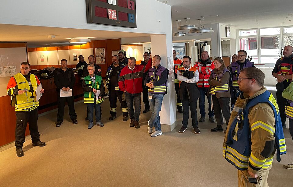 Aufgabe der Feuerwehr war es den Brandherd zu lokalisieren und die etwa 25 Patienten, die größtenteils nicht gehfähig waren, in Sicherheit zu bringen, sagt Einheitsführer Dominik Herbert. Dazu mussten rettungs.- und sanitätsdienstliche Kräfte die Patienten in sicheren Bereichen erstversorgen, bevor sie nach draußen verbracht wurden. Für die Feuerwehr bedeutete dies im 8. Stockwerke eine Art Depot für Material und Atemschutzträger einzurichten, ebenso eine Patientenablage. Nachdem das Haus über zwei Treppenhäuser verfügte, konnten diese zum einen für die Feuerwehreinsatzkräfte genutzt werden und die andere Seite für den Patiententransport. Für die Feuerwehrleute ein Knochenjob, denn aufgrund des fiktiven Brandes konnten auch die Aufzüge nicht genutzt werden. Das bedeutet, dass auch das benötigte Schlauchmaterial über die Treppen nach oben getragen wurde. „Hier war Man-Power gefragt, eine große Stärke der Feuerwehren!“, lobt Elias Holzheimer.