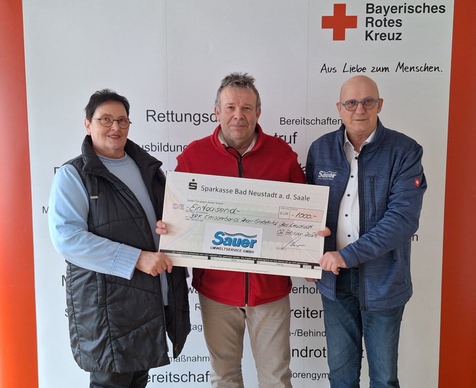 Die Firma Sauer Umweltservice GmbH hat dem BRK Kreisverband Rhön-Grabfeld eine großzügige Spende in Höhe von 1.000 Euro übergeben. Die symbolische Scheckübergabe fand bei einem gemeinsamen Treffen statt. Entgegengenommen wurde die Spende von BRK Kreisgeschäftsführer Ralf Baumeister.