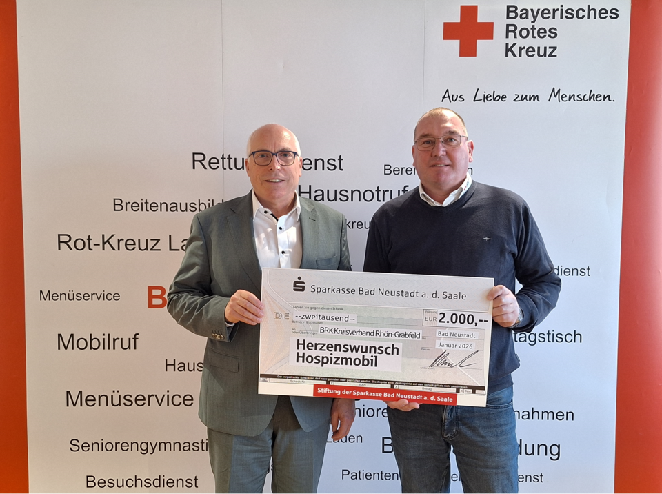 „Das Bayerische Rote Kreuz leistet für unsere Region eine unverzichtbare Arbeit – im Ehren- wie im Hauptamt. Die Förderung des Hospizmobil-Projekts ist uns ein besonderes Anliegen, weil sie unmittelbar Lebensqualität und menschliche Nähe stärkt,“ so Georg Straub, Vorstandsvorsitzender der Sparkasse Bad Neustadt. Die Spende ist Ausdruck der seit vielen Jahren bestehenden, vertrauensvollen Zusammenarbeit zwischen dem BRK und der Sparkasse.